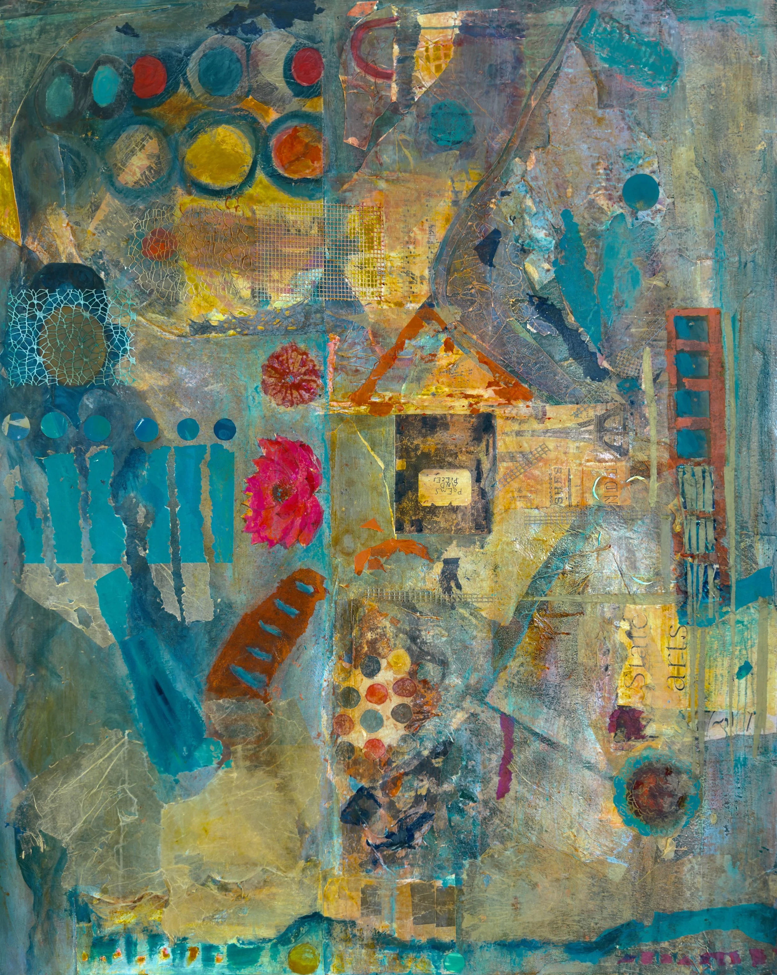 Built from paint, handmade papers and textures, botanical forms, fragments of text, fabrics, and keepsakes. More three-dimensional, richer in color, and more openly hand-made.
